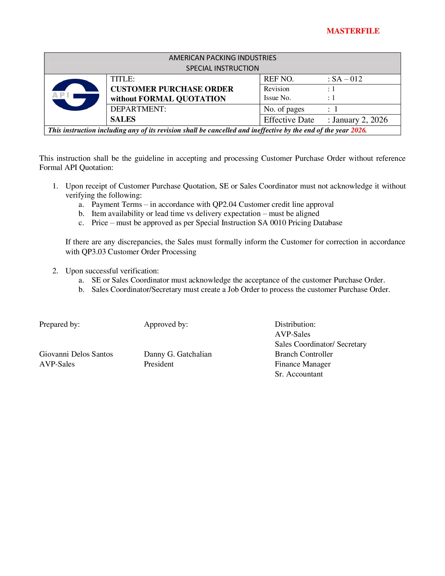 CUSTOMER PURCHASE ORDER W/O FORMAL QUOTATION