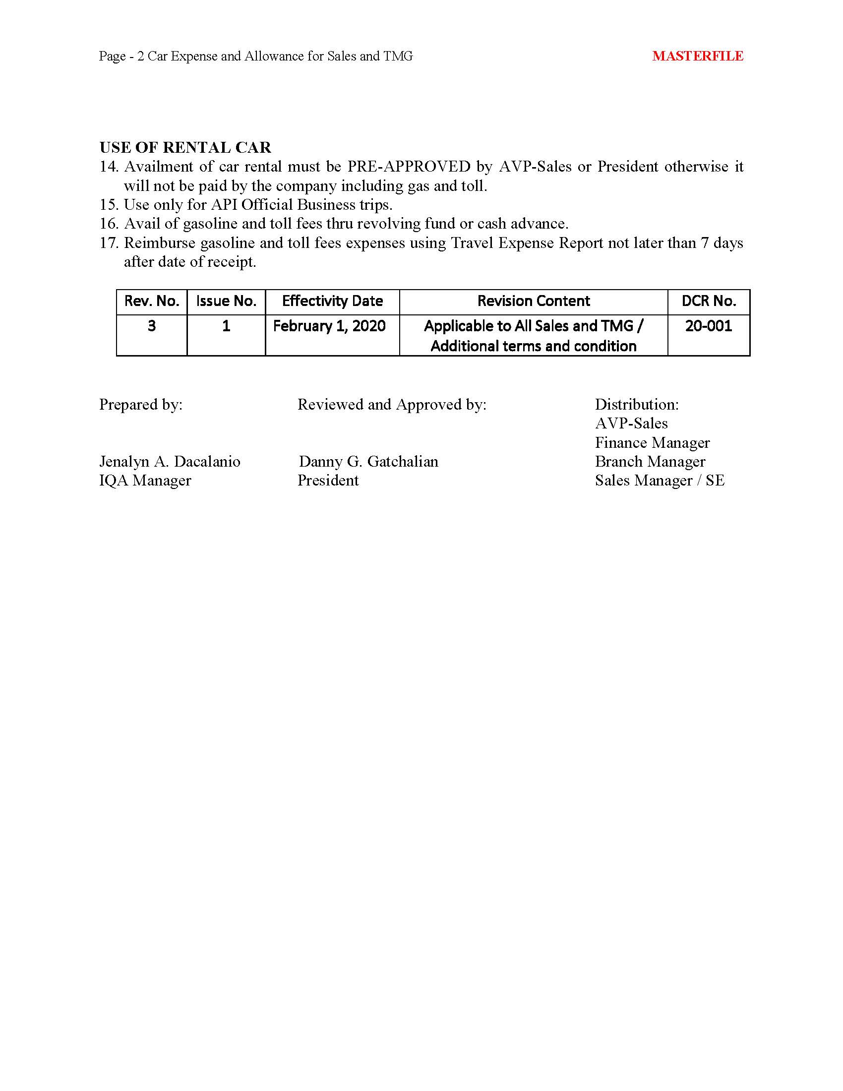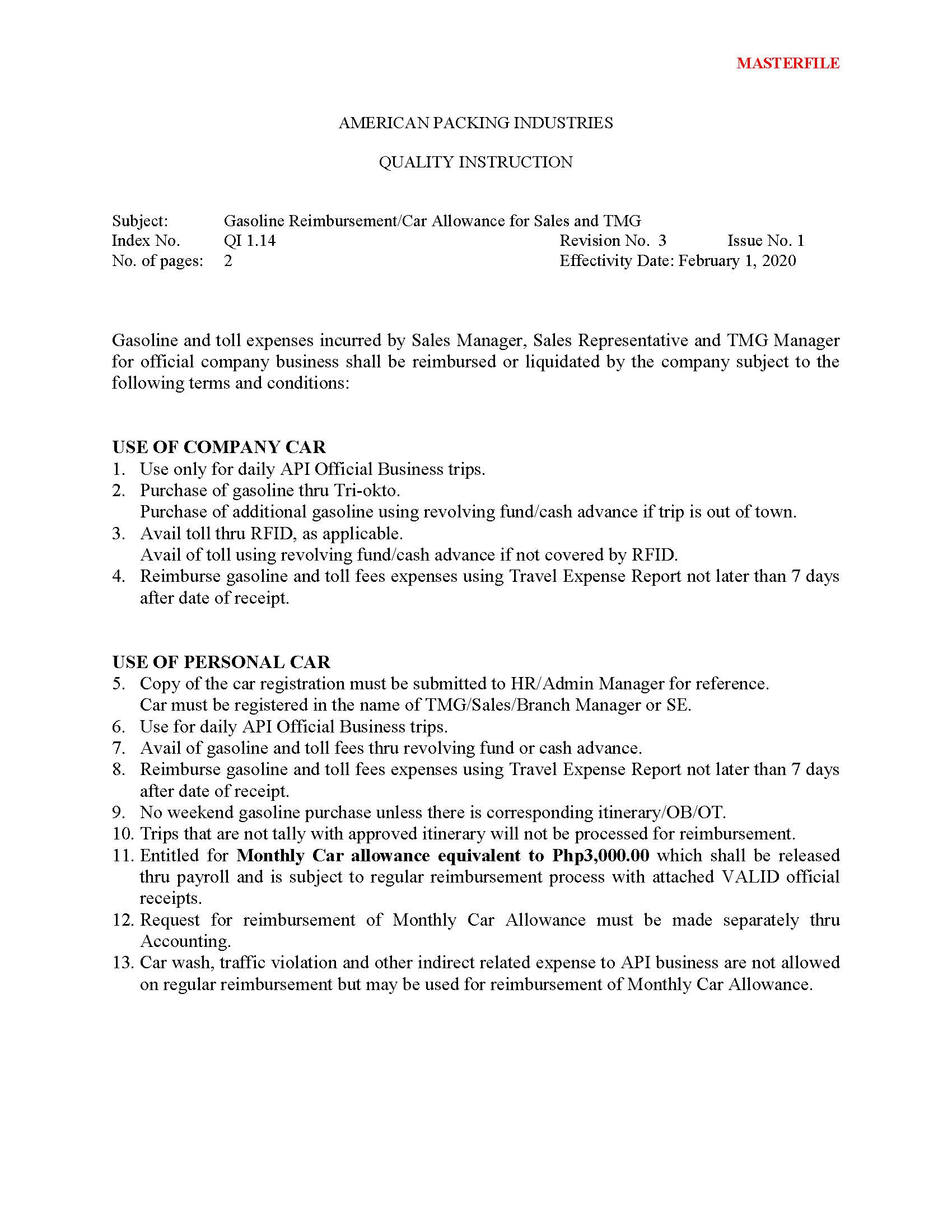 GASOLINE REIMBURSEMENT/CAR ALLOWANCE TO BRANCH MANAGERS
